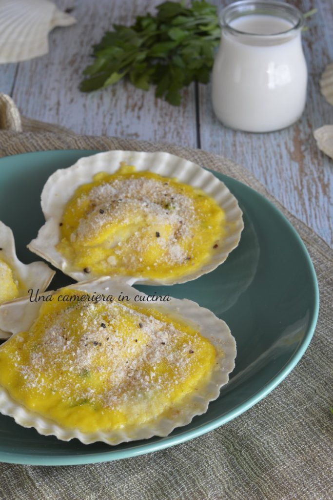 • Placez-les au centre de chaque coquille légèrement huilée, recouvrez-les de sauce béchamel au safran jusqu’à les couvrir et saupoudrez un peu de chapelure par-dessus.