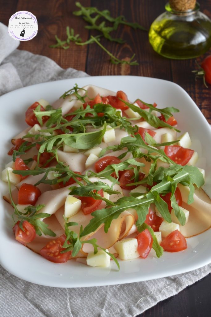 L’escalope de dinde avec roquette fromage et tomates cerises est un plat léger, savoureux et se prépare en très peu de temps!!! Pour cette recette, j’ai utilisé de l’escalope de dinde déjà tranchée, polyvalente et excellente pour les plats froids, à laquelle j’ai ajouté la roquette, la scamorza et des tomates cerises. Vous pouvez le servir comme entrée ou comme plat principal froid ou pour garnir une piadina, des sandwiches ou des tramezzini!!! Essayez aussi les lanières de balsamique roquette et tomates cerises. Si cette recette vous plaît et que vous ne voulez pas manquer les autres, suivez-moi sur ma page Facebook « Une serveuse en cuisine » ou dans le groupe dédié.