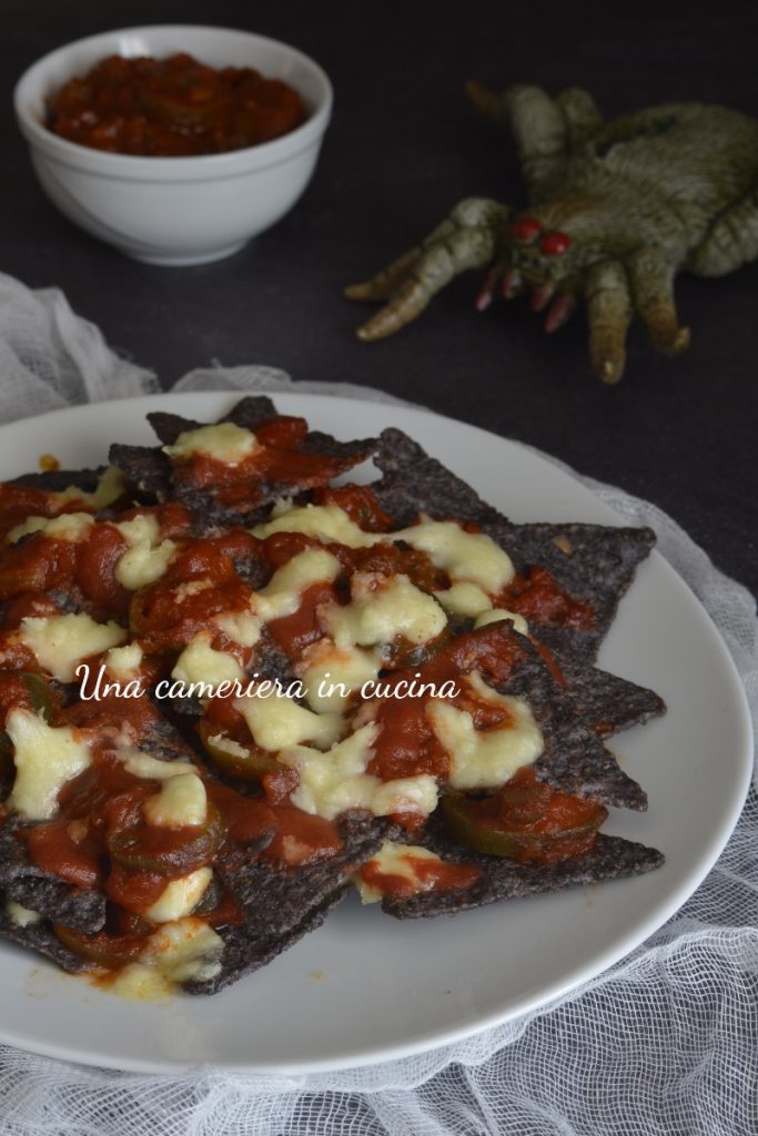 Les nachos d’Halloween sont un snack salé à déguster comme apéritif pour le soir d’Halloween. Délicieuses chips de tortilla de maïs bleu, même si la couleur tend vers le violet foncé, déjà prêtes, servies chaudes avec une sauce de style mexicain et de la mozzarella fondante. La sauce est à base de purée de tomates, piments jalapeno, au goût légèrement aigre-doux et piquant, très facile à préparer.