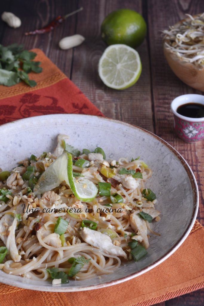 Le pad thaï au poulet est un plat traditionnel thaïlandais. La recette est très simple et rapide à préparer. Il s’agit d’un plat à base de pâtes, des nouilles de riz, légèrement plus épaisses que les vermicelles de riz orientaux classiques. Il est généralement accompagné de crevettes, ou de viande, comme dans ce cas, de blanc de poulet ou dans la version végétarienne avec du tofu. On y trouve également des germes de soja, des arachides, de la coriandre, du citron vert, du piment pour une touche épicée et de la sauce soja. À déguster soit comme plat unique soit comme entrée.