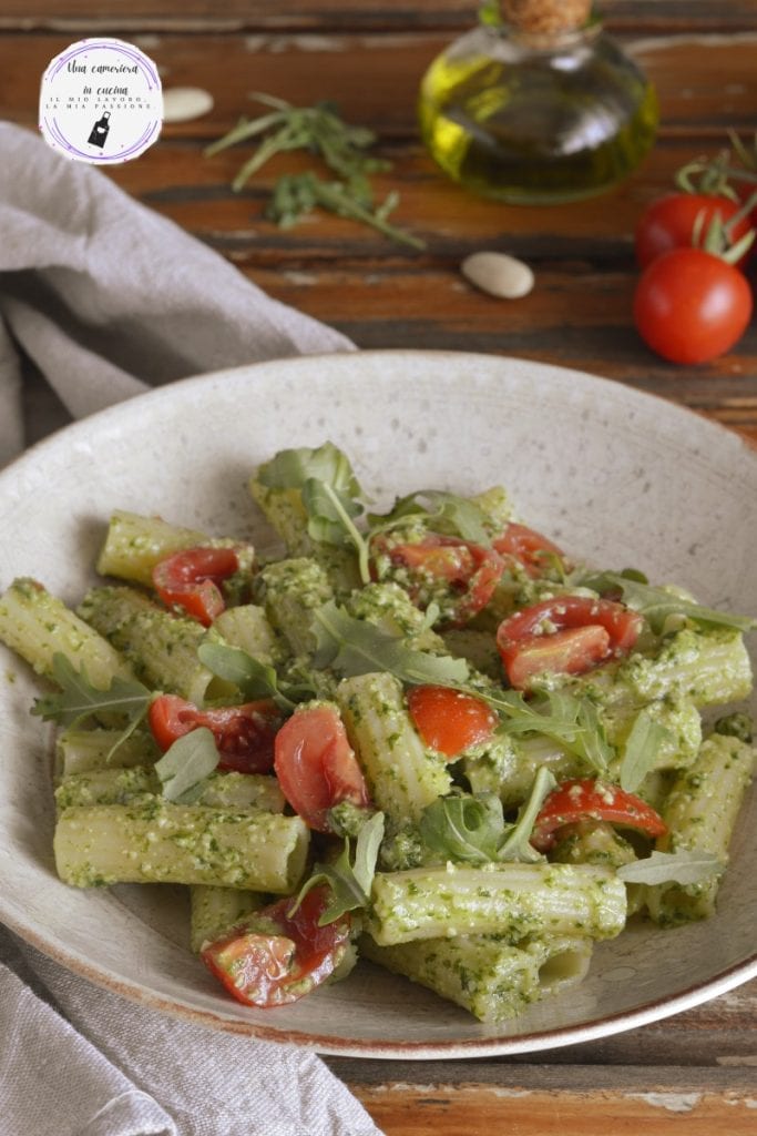 Les pâtes au pesto de roquette et tomates cerises sont un premier plat léger et savoureux. J’ai préparé le pesto de roquette et amandes à l’avance, mais il suffit de quelques minutes supplémentaires pour le cuisiner également sur le moment. Dernièrement, en plus du classique pesto alla genovese, d’autres types de pesto sont utilisés pour assaisonner les pâtes, comme dans ce cas celui de roquette et amandes. Excellent aussi à déguster comme pâtes froides !