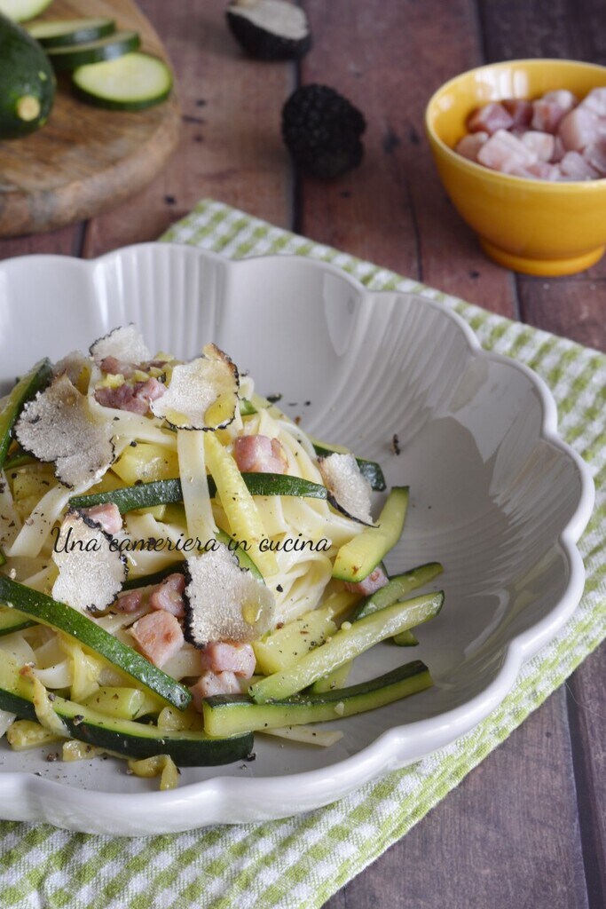 Les pâtes aux courgettes, lardons et truffe noire d’été sont un délicieux plat de pâtes à déguster pendant la période estivale. Pour les pâtes, vous pouvez choisir celles que vous préférez, dans cette recette j’ai choisi des tagliatelles qui seront ensuite assaisonnées avec des courgettes et des lardons doux sautés à la poêle. Comme touche finale, la truffe noire d’été (tuber aestivum), également appelée « scorzone ». Les différences entre la truffe noire (plus lisse) et le scorzone (plus grossier) résident dans les périodes de récolte, le premier en hiver et le second en été. De plus, la typologie du sol, la truffe noire pousse dans les sols sablonneux, tandis que celle d’été dans les sols argileux.