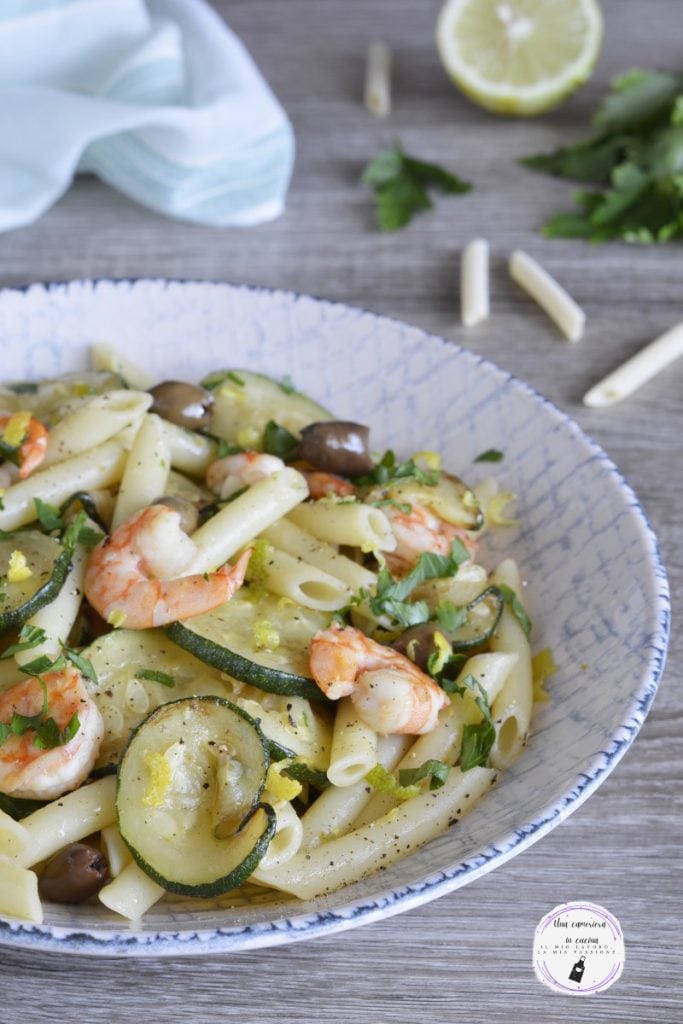 Les pâtes avec courgettes, crevettes bouquet et olives sont un plat principal frais et savoureux. Une délicieuse salade de pâtes, dans ce cas, j’ai choisi des penne, mais vous pouvez opter pour le format que vous préférez. La sauce est simple et légère à base de courgettes sautées à la poêle, queues de crevettes bouquet, olives taggiasche et zeste de citron.
