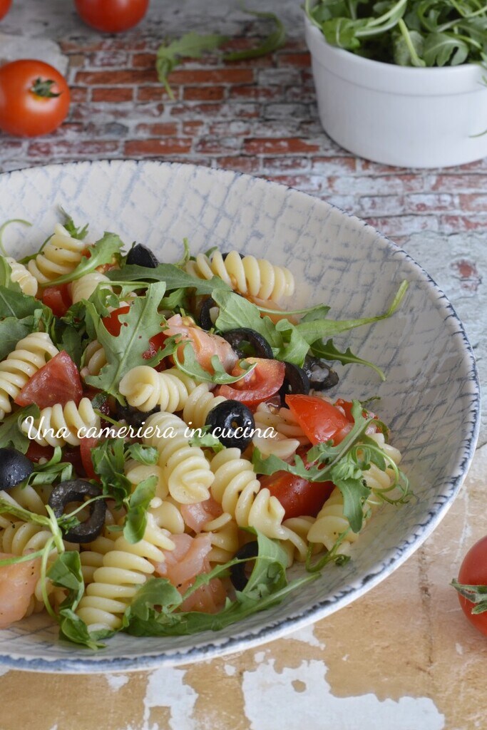Les pâtes froides avec tomates cerises, saumon et roquette sont un plat principal frais et savoureux pour la saison chaude. De plus, elles sont également faciles et rapides à préparer. Choisissez le format de pâtes que vous préférez, de préférence court, et pendant qu’elles cuisent, préparez la garniture à base de tomates cerises, saumon fumé, olives noires et roquette. Délicieux!!!