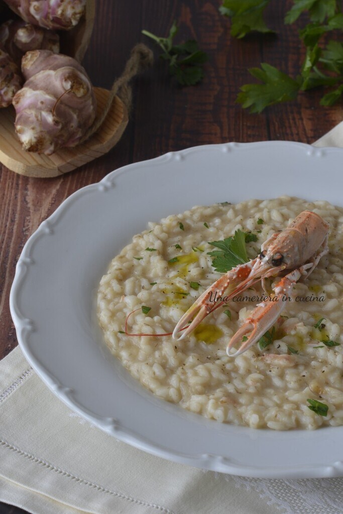 Le risotto aux langoustines et crème de topinambour est un délicieux plat principal, élégant à servir surtout lors des grandes occasions comme les fêtes de Noël. Au goût délicat, ce risotto est préparé avec une simple crème de topinambour, un tubercule ressemblant à la pomme de terre avec une saveur similaire à celle de l’artichaut et des langoustines légèrement sautées à la poêle. Le tout est relevé et parfumé par la bisque de langoustines, c’est-à-dire un bouillon ou plutôt une réduction, produite par l’ébullition des restes de ces dernières qui donnent saveur et couleur au risotto.