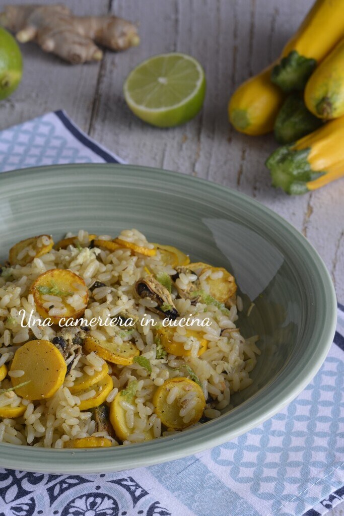 Le riz aux courgettes, moules, gingembre et lime est un plat principal aux saveurs exotiques. Une légère revisite du risotto classique aux courgettes et moules, à laquelle j’ai voulu ajouter des saveurs insolites, mais qui sont souvent utilisées en cuisine ces derniers temps, comme le gingembre frais, épicé, et le lime, semblable au citron, plus amer et acide. Pour la recette, j’ai utilisé des courgettes jaunes, plus douces que les vertes et qui apportent une belle couleur estivale. Quant aux moules, pour plus de praticité, j’ai utilisé celles en saumure, mais si vous préférez, vous pouvez utiliser celles surgelées ou fraîches. À déguster dès qu’il est prêt ou même froid comme une salade.