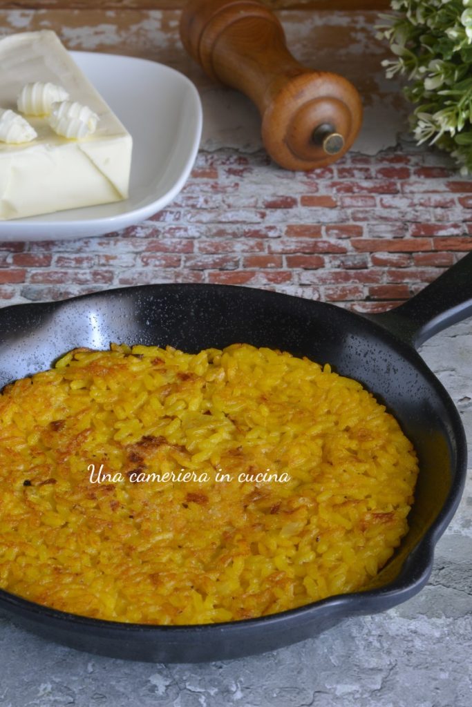 • Dans une poêle antiadhésive, faites fondre quelques noix de beurre et quand il est fondu, versez le risotto. Aplatissez-le bien avec une cuillère en bois ou une spatule et donnez-lui une forme ronde et haute de 1 cm maximum.