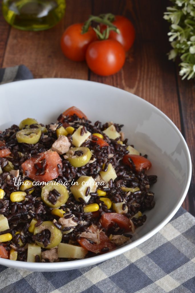 La salade de riz noir vénéré avec thon et fromage est un plat frais et savoureux à déguster pendant la saison chaude de l’été. À servir aussi bien comme plat principal que comme plat unique, mais aussi comme apéritif à un buffet. Pour la recette, j’ai utilisé le riz noir vénéré, une variété parfaite à déguster froid comme dans les salades de riz, auquel j’ai ajouté du thon à l’huile, des olives vertes, du maïs, du fromage emmental et des tomates cerises.
