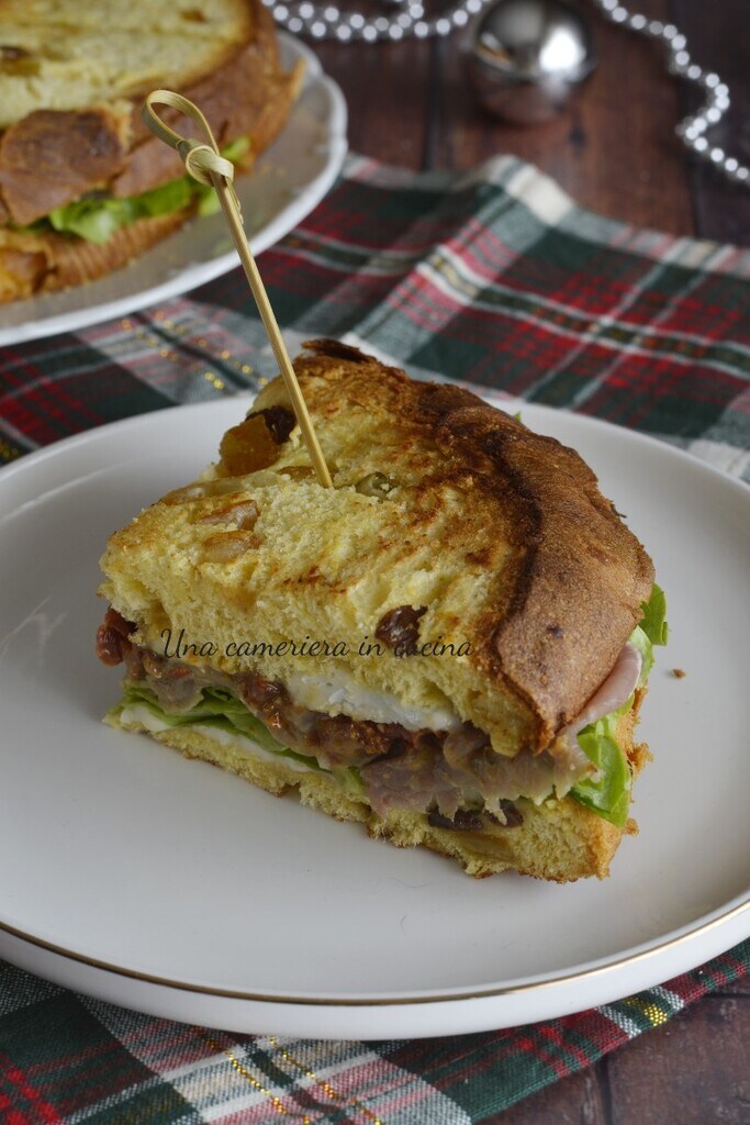 Le sandwich de panettone est une excellente idée pour recycler le panettone restant des fêtes de Noël (surtout à l’occasion de la Fête de la Saint-Blaise, où il est coutume de consommer le panettone restant) ou pour apporter à table un plat différent et original. Pour la recette, je n’ai pas utilisé le classique panettone gastronomique destiné à la création de recettes salées, mais le panettone proprement dit, le sucré avec des raisins secs et des fruits confits. Je me suis inspirée de la vidéo d’un chef de Milan, qui proposait de réaliser un sandwich salé à base de panettone, alors j’ai changé quelques ingrédients et voici un plat à essayer avec un parfait contraste sucré-salé. La garniture est composée de gorgonzola doux, de salade, de roast-beef déjà prêt (je l’ai pris chez mon charcutier de confiance), d’une sauce au miel d’acacia et à la moutarde et de tomates séchées à l’huile. À servir comme apéritif ou entrée.
