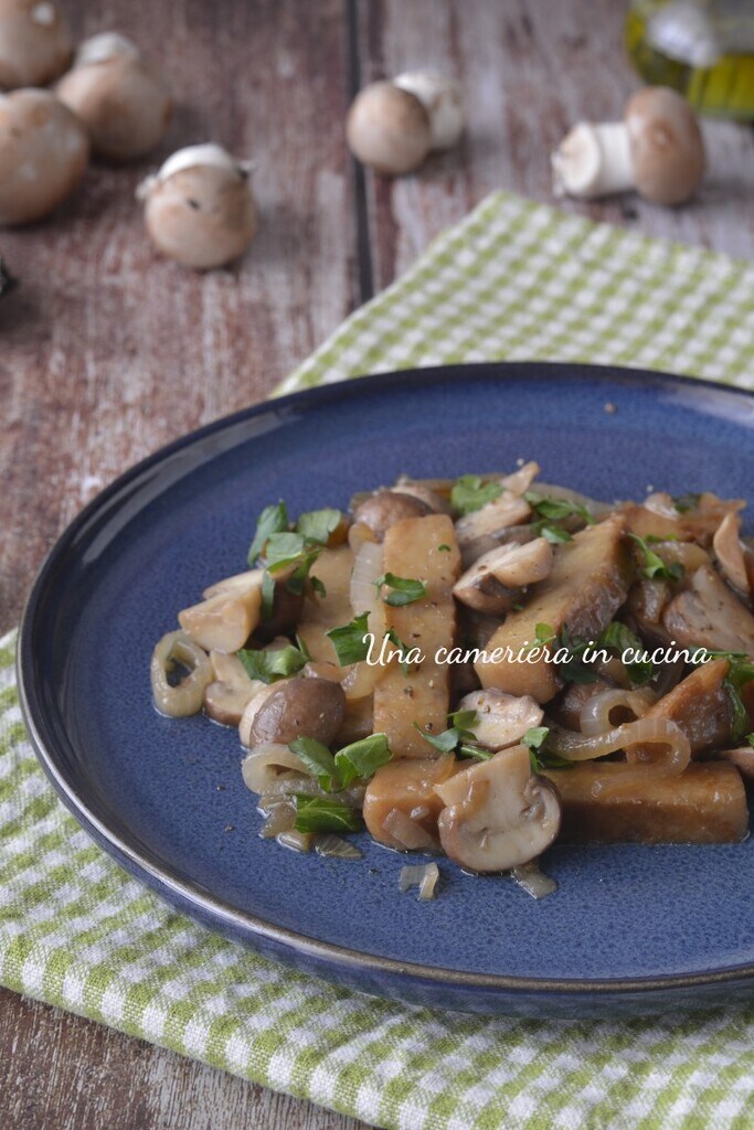 Le seitan aux champignons est un plat principal vegan facile à préparer, simple et savoureux. De délicieux morceaux de seitan, c’est-à-dire le substitut de viande à base de blé et riche en protéines, sont sautés à la poêle avec des oignons et champignons, dans ce cas j’ai choisi des champignons de Paris, mais vous pouvez utiliser ceux que vous préférez. À déguster tel quel ou avec de la purée de pommes de terre ou de la polenta.
