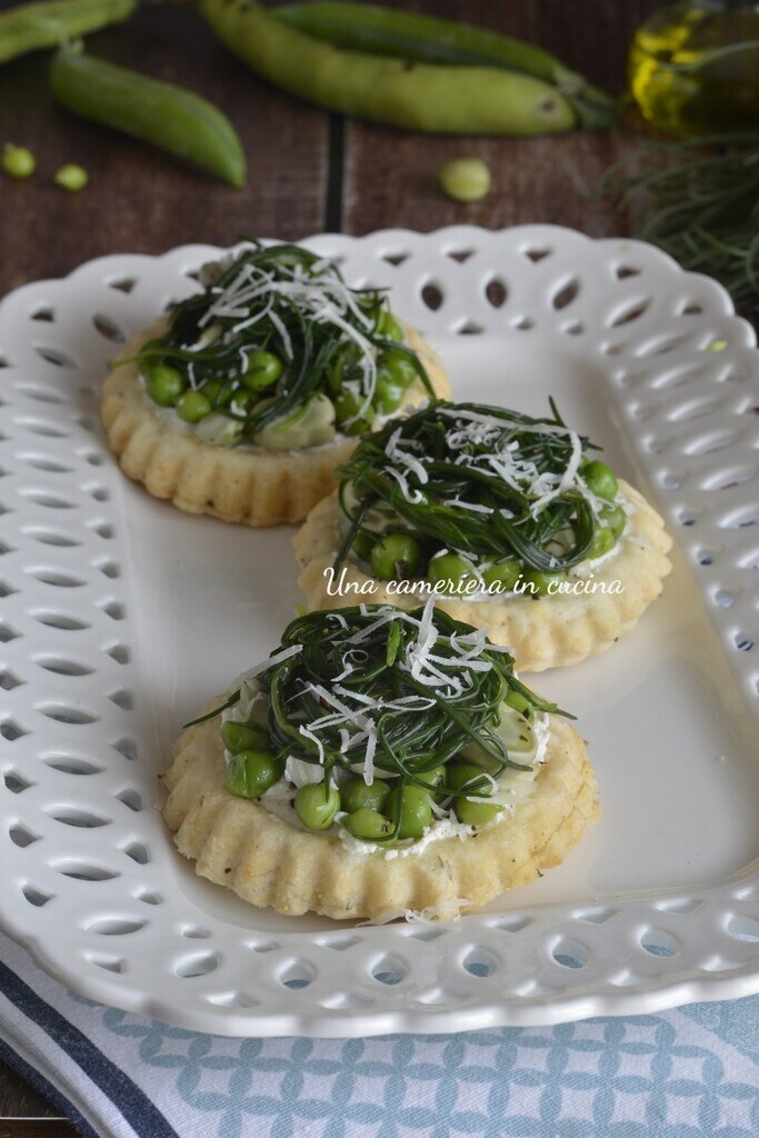 Les tartelettes au chèvre, petits pois, fèves et salades de campagne sont une entrée fraîche et printanière, préparée avec les ingrédients de la saison, comme les petits pois et les fèves fraîches et les salades de campagne. Délicieuses tartelettes de pâte sablée, avec une texture plus friable que la pâte sablée classique, parfaite pour les préparations salées. Elles sont garnies d’une simple crème de fromage de chèvre et décorées avec des petits pois et des fèves parfumés à la menthe, des copeaux de pecorino romano et des salades de campagne qui apportent encore plus de fraîcheur et une texture différente au palais. Idéales pour les apéritifs ou les entrées, surtout lors d’occasions spéciales comme Pâques.