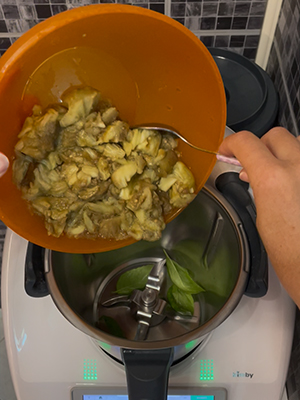 • Mettez dans le bol du Bimby le basilic et la chair de l’aubergine et hachez pendant 10 secondes à vitesse 6.