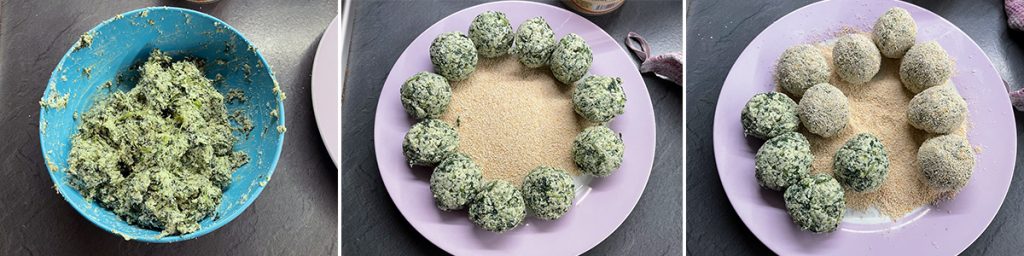 Mélange les ingrédients avec une fourchette et ajuste le sel. Tu dois obtenir une pâte manipulable pour former les boulettes. Mets-les dans une assiette avec de la chapelure et roule-les dedans.