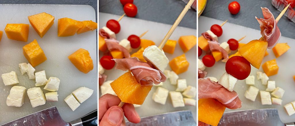 Coupe en morceaux aussi bien la mozzarella que le melon. Puis enfile sur chaque brochette un morceau de melon, un peu de jambon, la mozzarella et une tomate cerise, en alternant les ingrédients comme je l’ai fait.