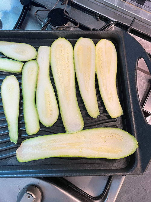 Chauffez un gril sur le feu et, quand il est chaud, disposez les courgettes sans les superposer. Si vous les coupez légèrement épaisses comme les miennes, il n’est pas nécessaire d’ajouter de l’huile, mais si vous les préférez très fines, je vous conseille de badigeonner le gril pour éviter qu’elles ne collent.