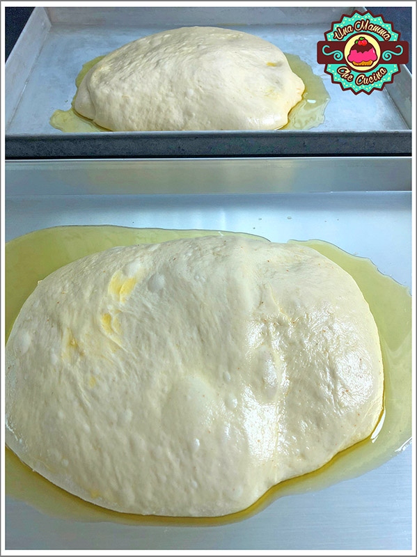 Huilez un plat de 30 x 40 cm avec de l’huile, placez la pâte au centre puis retournez-la, de cette façon une croûte ne se formera pas à la surface car elle est huilée. Faites lever pendant au moins une heure, jusqu’à ce qu’elle double de volume, puis étalez-la en l’aplatissant avec les doigts directement dans le plat.