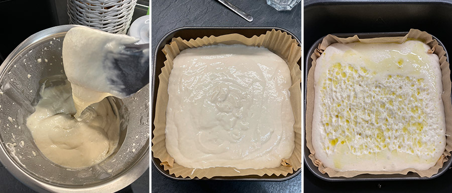 Versez dans un moule en métal de 20×20 cm recouvert de papier sulfurisé, couvrez de film plastique et laissez lever jusqu’à ce qu’elle double. À ce stade, ajoutez une pulvérisation d’huile sur la surface et une pincée de sel.