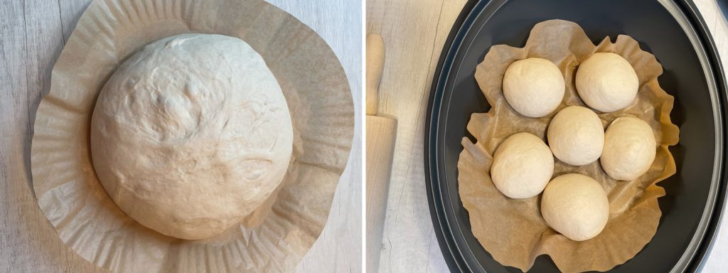 Transfère la pâte levée sur le plan de travail, divise-la en 6 morceaux égaux et forme 6 boules. Laisse-les reposer 30 minutes couvertes d’un torchon.