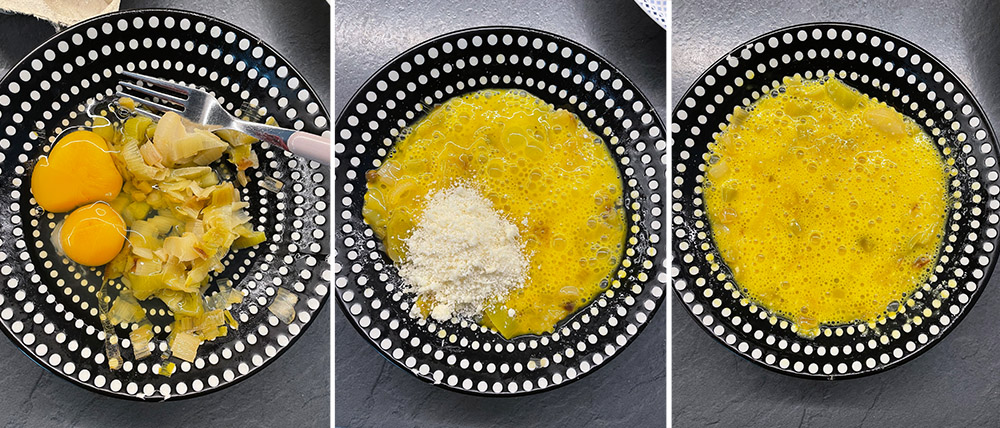 • Ajoutez aux poireaux les œufs, battez avec une fourchette et ajoutez le fromage grana et une pincée de sel, en mélangeant à nouveau.