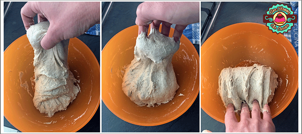 Détachez la pâte du bol et soulevez un bord, en le tirant vers le haut pour ensuite le replier sur lui-même, tournez le bol de 90 degrés et repliez la pâte à nouveau sur elle-même, en tout quatre fois. Après 10 minutes, répétez les plis, vous verrez comment la pâte change de consistance!