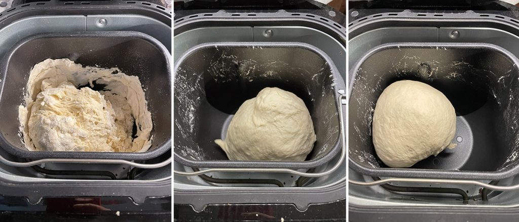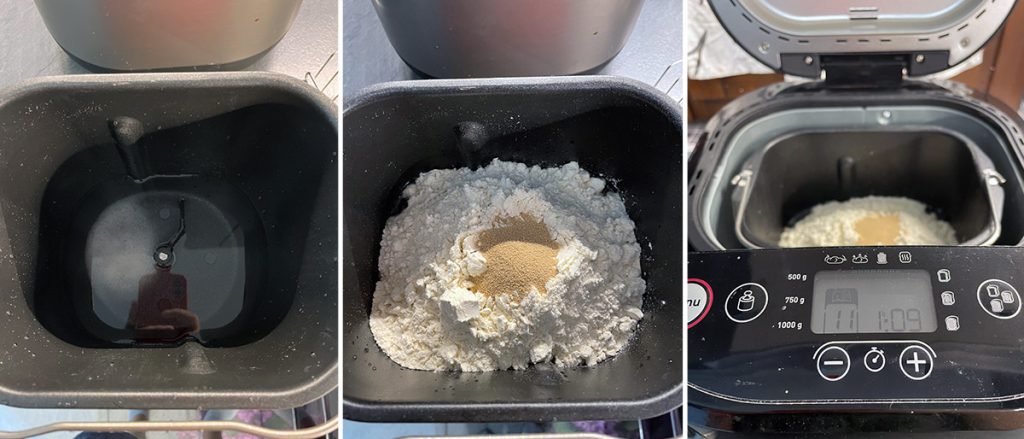 Insérez dans la cuve de la machine à pain tous les ingrédients dans l’ordre indiqué. Commencez par les liquides, d’abord l’eau et l’huile, puis ajoutez le sel, la farine et enfin la levure. Fermez le couvercle et allumez la machine à pain en utilisant le programme de pétrissage uniquement, sur la mienne c’est le numéro 11.
