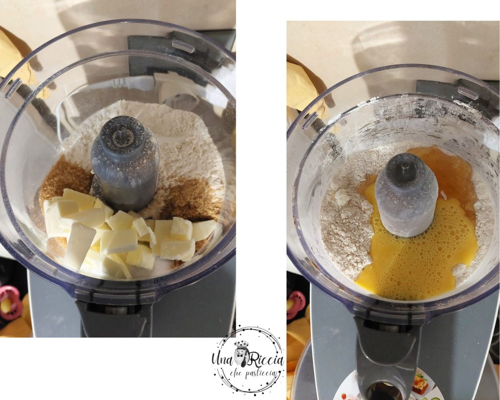 • Dans le bol du mixeur, mettez la farine (en laissant une demi-cuillère pour le plan de travail), le gingembre en poudre, la cannelle, la noix de muscade, le sel et le beurre froid en morceaux, puis actionnez et sablez en faisant tourner la machine à la vitesse maximale pour quelques secondes, puis ajoutez l’œuf et le miel (ou la mélasse).