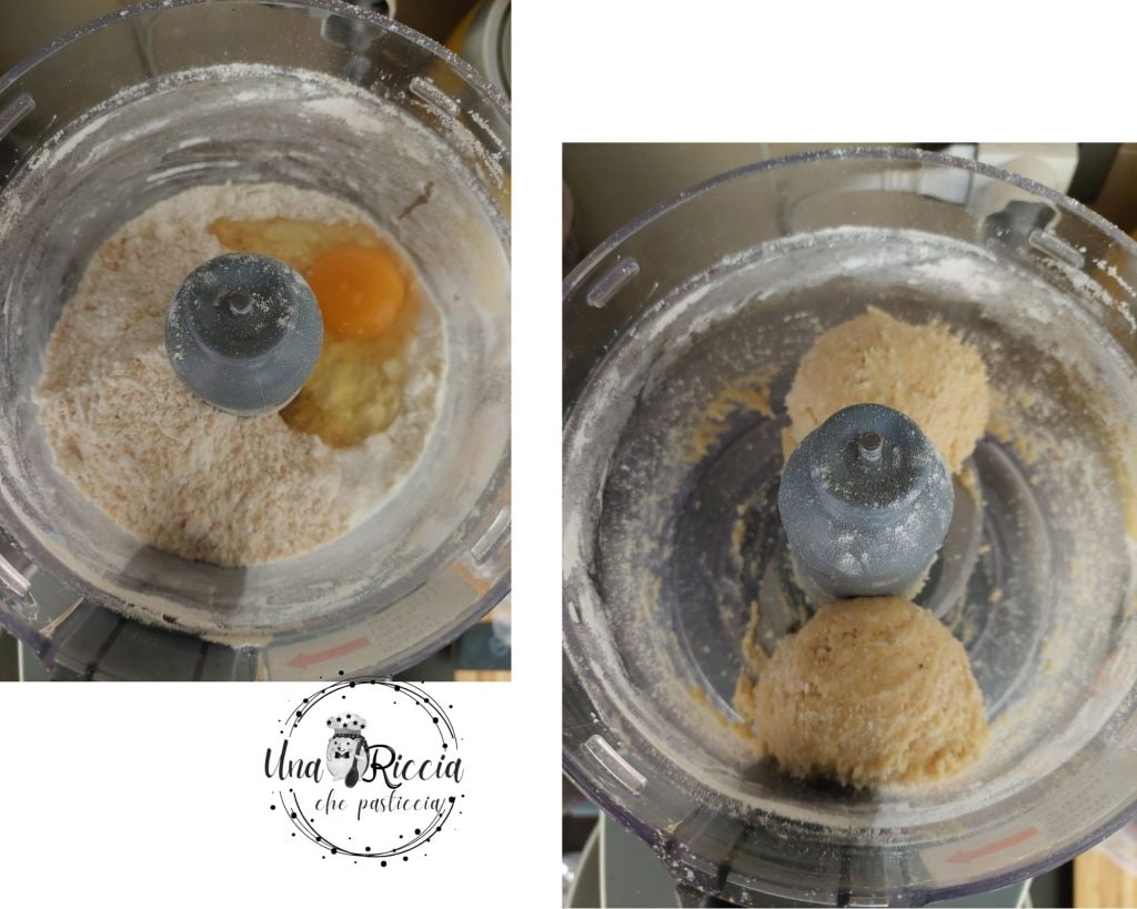 À ce stade, ajoutons toujours dans le bol du mixeur, l’œuf, une pincée de sel et la farine de noisettes que nous avons préparée auparavant. Actionnons à nouveau le mixeur et laissons tourner à vitesse moyenne jusqu’à ce que la pâte se compacte sur un côté.