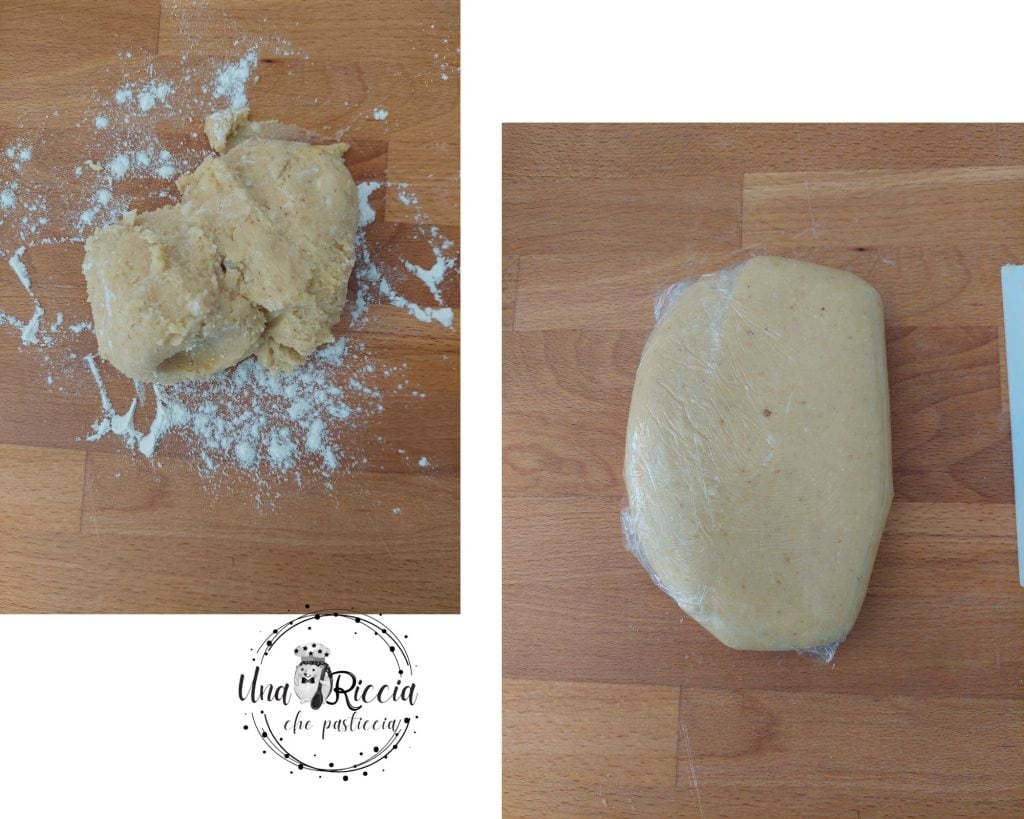 Maintenant que la pâte aux noisettes est prête, versons-la sur un plan de travail légèrement fariné, travaillons-la rapidement pour former une boule, aplatissez-la et enveloppez-la dans un film alimentaire puis placez-la au réfrigérateur pour reposer pendant au moins 1 heure.