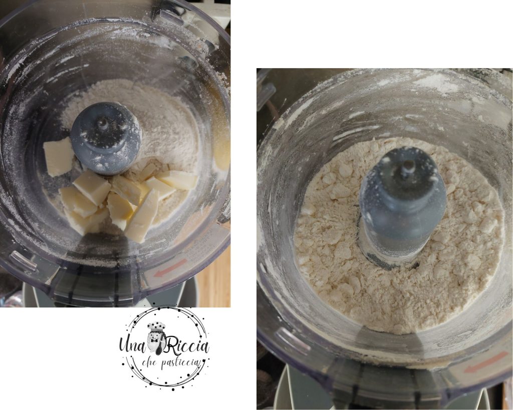 Déplaçons la farine obtenue dans un bol et mettons dans le mixeur la farine 00 et le beurre froid en morceaux, actionnons et laissons mixer pendant environ 20 à 30 secondes jusqu’à ce que le mélange devienne comme du sable granuleux.