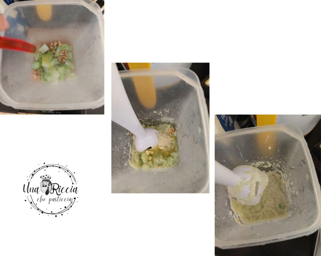 Égouttons la tige de brocoli quand elle sera tendre pour y enfoncer facilement la fourchette, mettons-la dans un récipient adapté au mixeur plongeant, ajoutons deux cerneaux de noix, le parmesan râpé et commençons à mixer en ajoutant également l’huile d’olive. Rectifions l’assaisonnement en sel et poivre. Mixons jusqu’à obtenir une crème lisse et homogène.