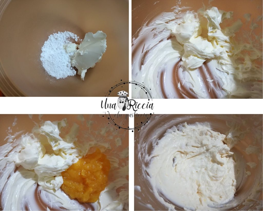 • Dans un bol, mettons le mascarpone avec le sucre glace et ramollissons-les avec un fouet puis ajoutons la ricotta et le lait. Mélangeons le tout et ajoutons le kaki que nous avons mixé. La crème est prête.