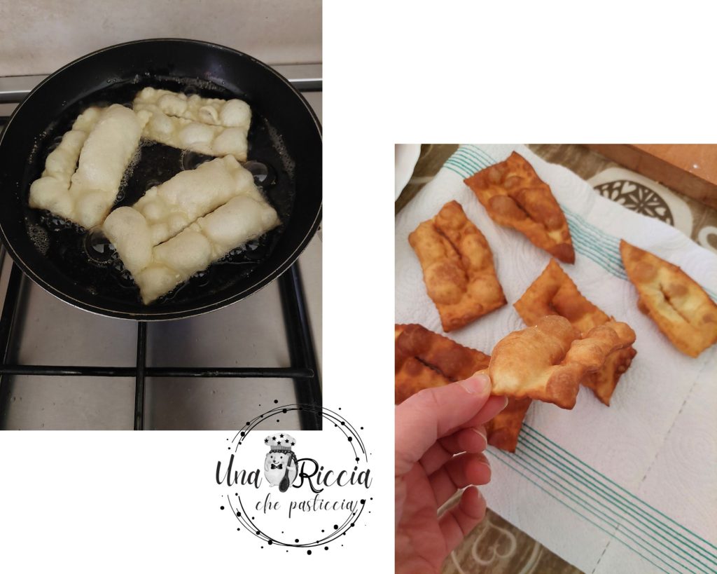 Dans une poêle à frire ou une friteuse, versons l’huile de graines et faisons chauffer l’huile, quand elle sera prête, commençons à cuire les chiacchiere au lait, le temps de cuisson est très court car elles sont fines, donc dès qu’elles sont dorées, égouttons-les et posons-les sur du papier absorbant pour éliminer l’excès d’huile.