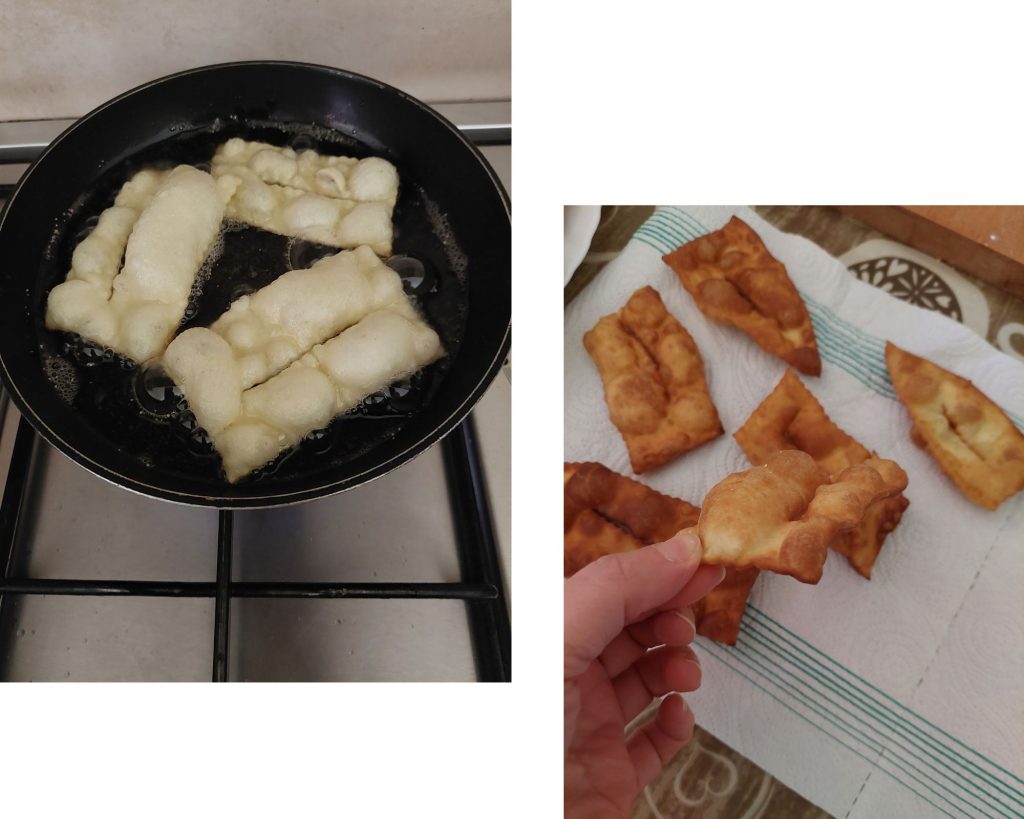 Dans une poêle à frire ou dans la friteuse, mettons l’huile de graines, attendons qu’elle soit chaude, ensuite nous pouvons frire nos desserts de carnaval, peu à la fois et en les tournant rapidement car, étant fins, ils cuisent vite. Égouttons-les sur un papier absorbant et laissons refroidir.