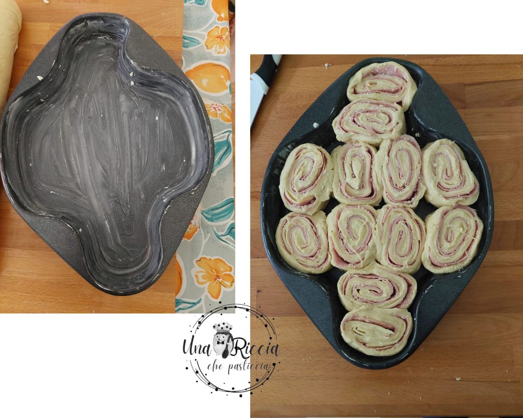 Prenons un moule pour colombe et beurrons-le bien puis commençons à insérer les tranches de pâte que nous avons coupées, 8 serviront pour la partie centrale et les 4 autres pour la tête et la queue. Une fois toutes les tranches insérées, couvrons avec le film plastique et laissons lever pendant environ une heure dans le four éteint.
