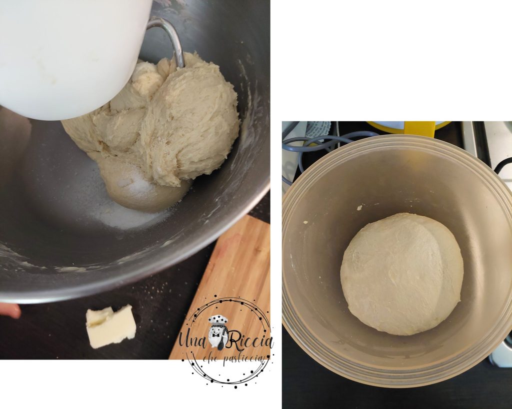 Quand il vous restera quelques morceaux de beurre à ajouter, ajoutez le sel puis continuez avec le beurre. Laissez la machine travailler jusqu’à ce que la pâte soit bien accrochée au crochet et donc complètement décollée des parois formant une boule. Renversons-la sur un plan de travail, donnons-lui une forme sphérique et laissons-la lever dans un bol légèrement huilé et couvert de film plastique pendant environ 2 heures et jusqu’à ce qu’elle double de volume.