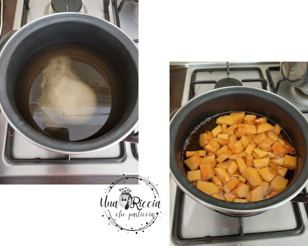 Dans une casserole, mettons l’eau, le sucre et le sel, mélangeons et portons à ébullition. À ce moment, ajoutons les cubes de potiron et faisons cuire pendant 5 minutes.