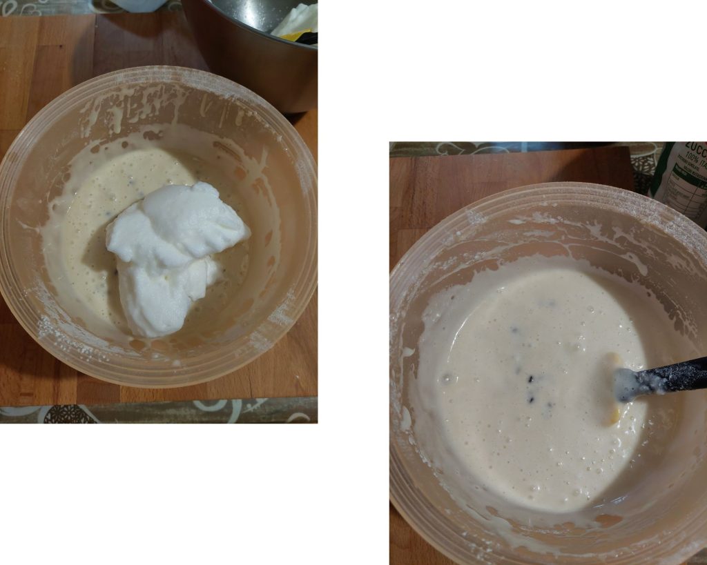 • Maintenant que les blancs d’œufs sont montés en neige et que la base de la pâte est prête, nous pouvons les ajouter en versant quelques cuillerées de blancs à la fois dans la pâte et en mélangeant délicatement pour ne pas la faire retomber.