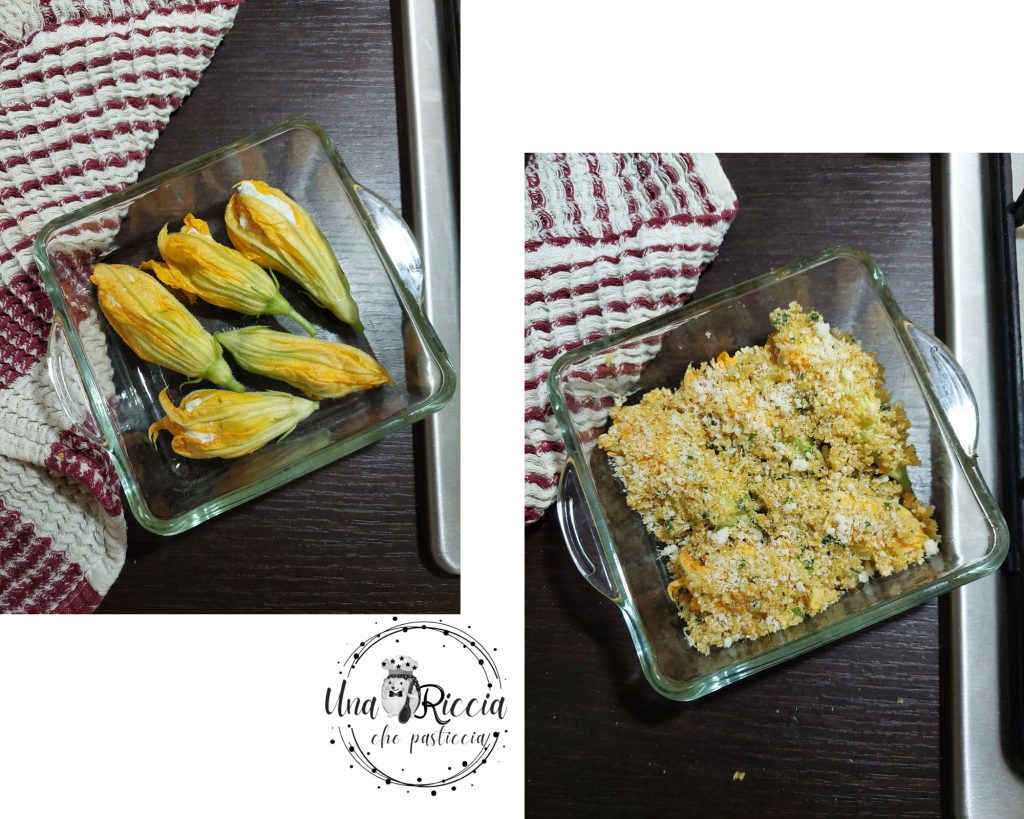 Disposez les fleurs de courgette dans un plat adapté au four, ajoutez un filet d’huile d’olive et disposez les fleurs de courgette farcies puis saupoudrez-les de la panure que nous avons préparée.