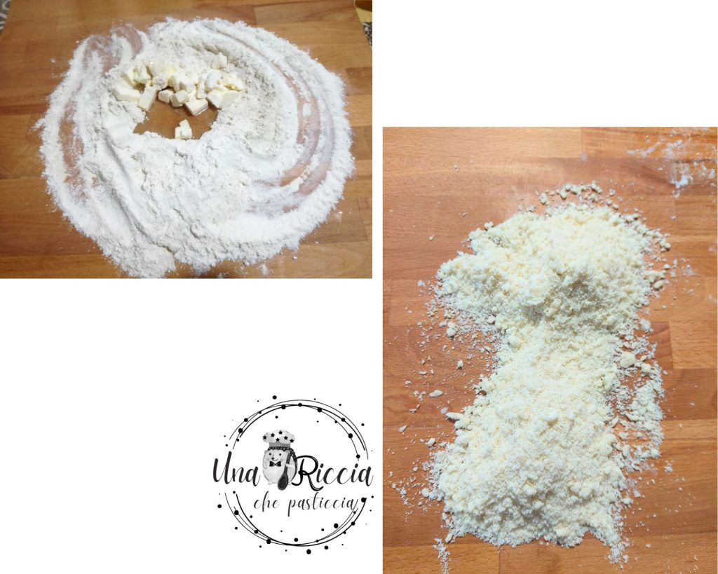 Sur un plan de travail, disposons les farines en formant une fontaine et au centre, mettons le beurre froid coupé en petits morceaux et commençons à les travailler ensemble, d’abord en pétrissant puis en frottant les ingrédients entre les mains pour obtenir une texture semblable à celle du sable.Reformons une fontaine et mettons à l’intérieur l’œuf, le jaune d’œuf, l’huile de graines, le sucre de canne et la pincée de sel, puis travaillons la pâte rapidement pour ne pas trop chauffer le beurre. Nous obtenons une boule lisse et homogène.