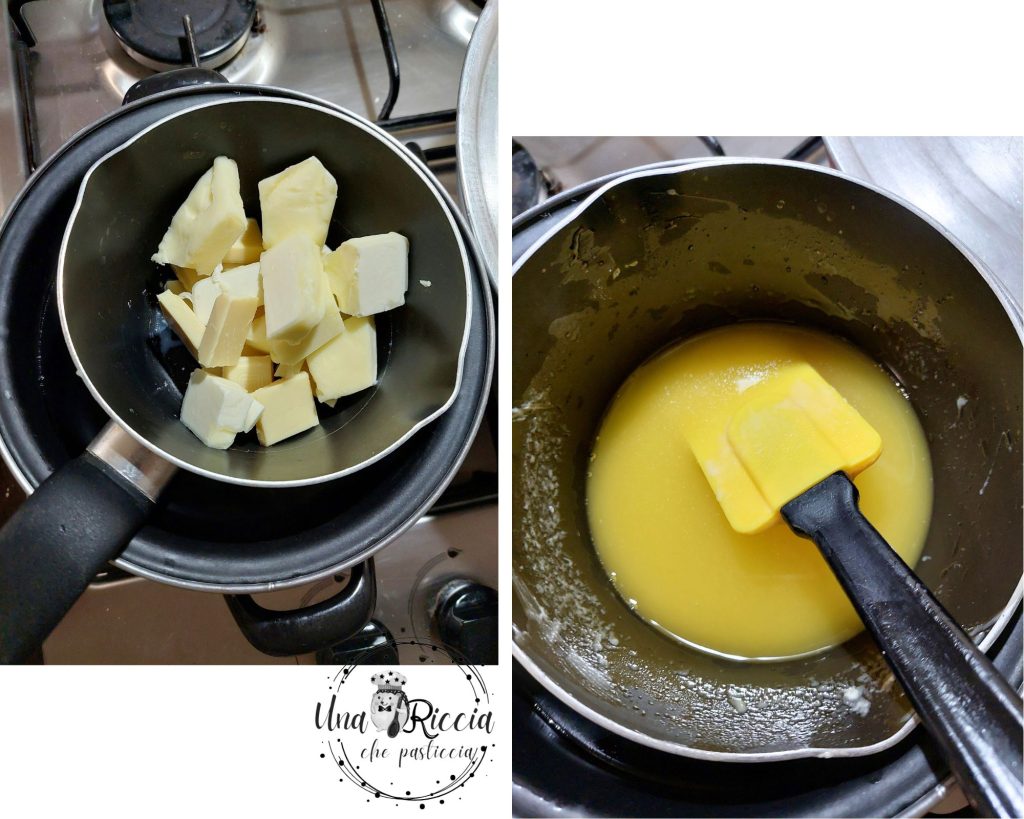 Pour commencer, occupons-nous du chocolat blanc, cassons-le en morceaux et mettons-le dans une casserole adaptée pour le bain-marie ou le micro-ondes avec le beurre et laissons-les fondre.