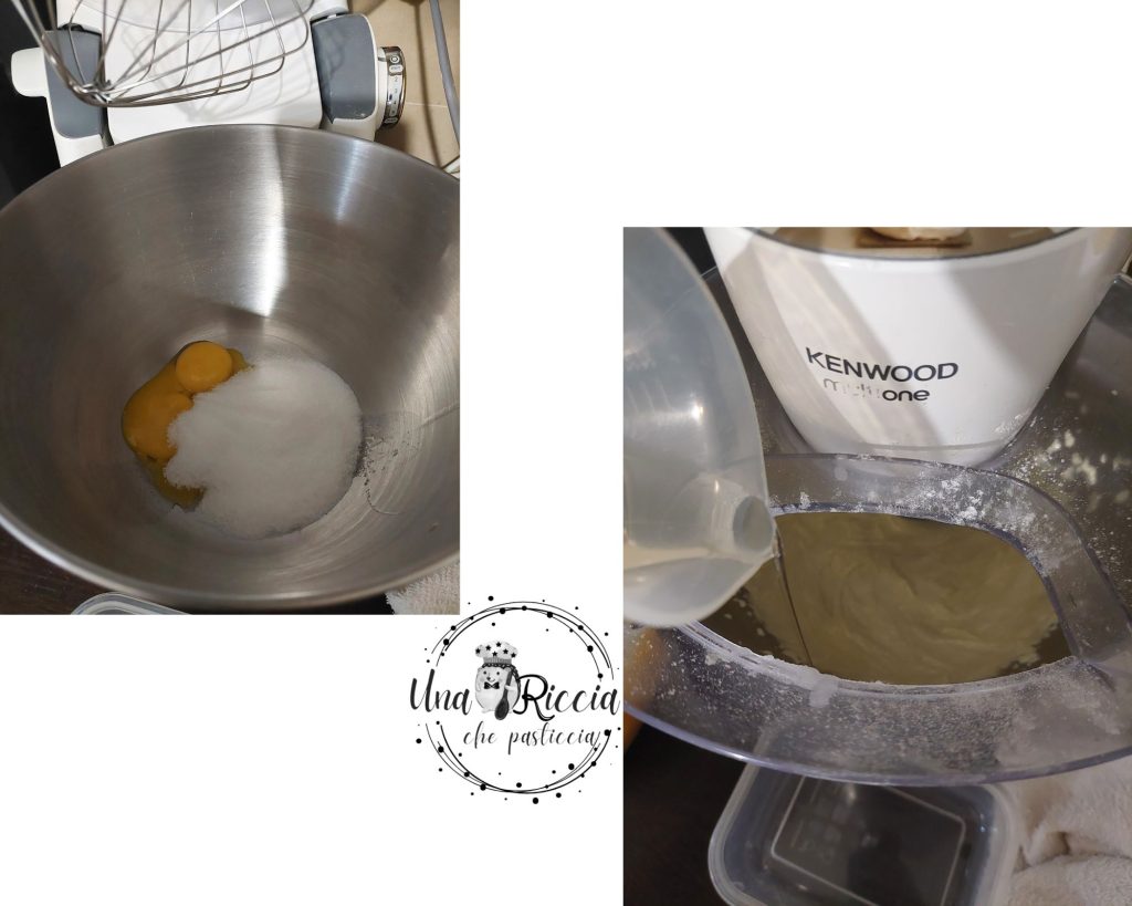 Lorsque le mélange est bien mousseux, ajoutez la farine tamisée et continuez à mélanger avec le fouet, puis ajoutez la purée de citrouille et laissez mélanger encore un peu.
