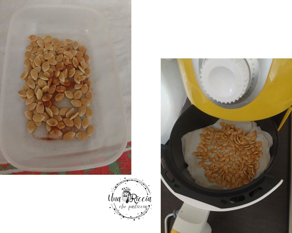 Une fois le temps écoulé, les graines seront sèches et nous pourrons procéder à la torréfaction. Mettons donc les graines dans un bol, ajoutons une cuillère d’huile d’olive, une pincée de sel et de paprika et mélangeons. Mettons un peu de papier sulfurisé dans la friteuse à air et versons les graines assaisonnées.