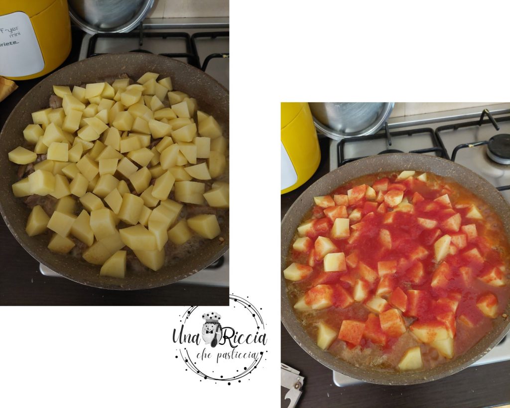 À ce stade, les pommes de terre bouillies seront tendres, égouttons-les et ajoutons-les dans la poêle avec la viande, ajoutons également la sauce tomate, salons et laissons cuire à feu moyen-doux pendant une dizaine de minutes, si nous constatons que cela sèche trop, ajoutons un peu d’eau chaude.