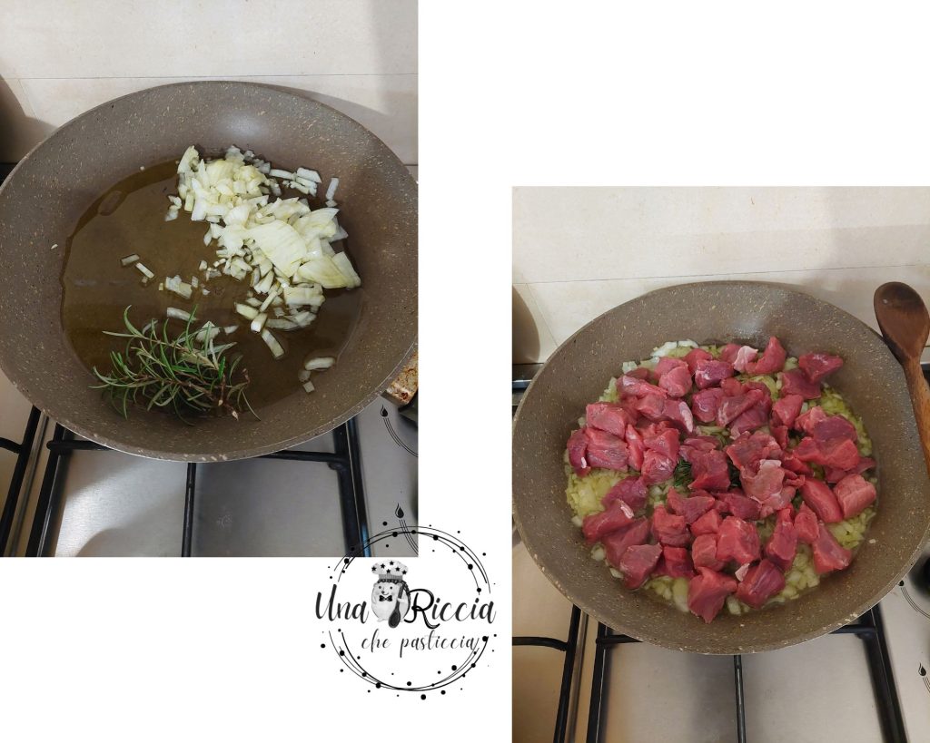Prenons l’oignon, retirons la peau et coupons-le grossièrement. Dans une poêle antiadhésive, mettons l’huile d’olive avec l’oignon et le romarin et faisons légèrement revenir. Maintenant, ajoutons la viande dans la poêle et faisons-la dorer de tous les côtés, puis ajoutons le vin et laissons évaporer tout l’alcool.