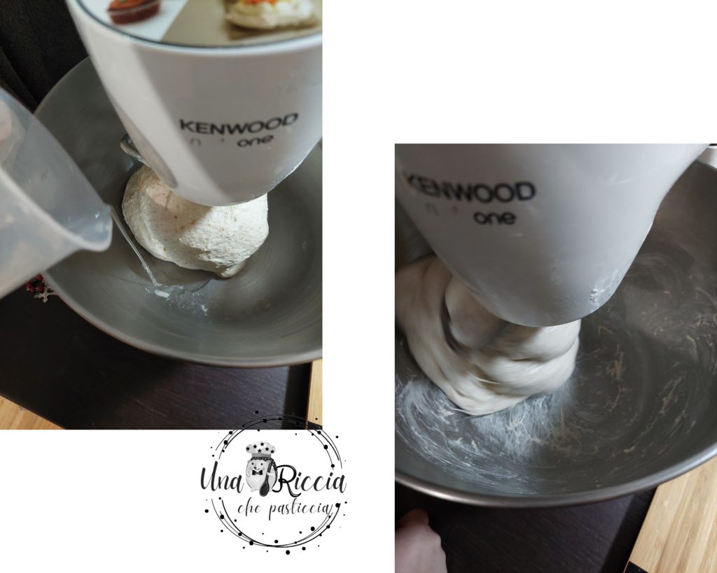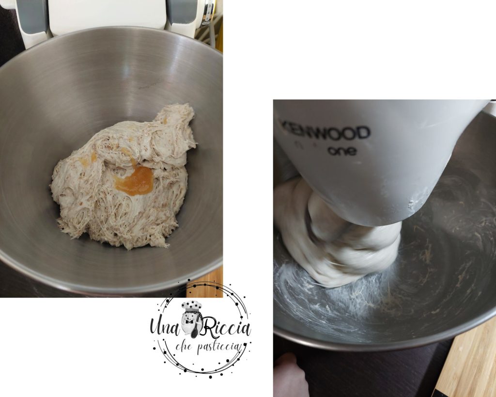 Après cinq minutes, vous verrez que la pâte commence à se structurer, commencez maintenant à ajouter le reste de l’eau (les 50 grammes) peu à peu, en en ajoutant seulement quand la précédente est bien absorbée. Continuez jusqu’à épuisement de l’eau.
