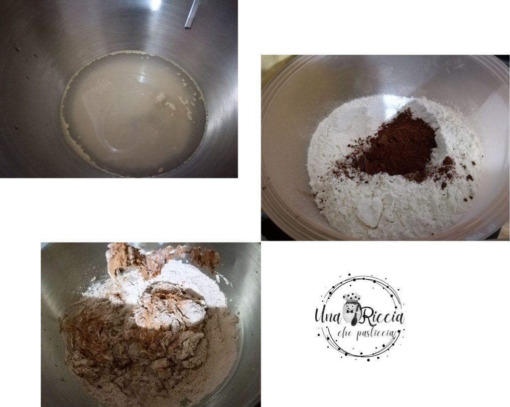 Dans le bol du robot pâtissier, mettons l’eau avec la levure et le sucre puis mélangeons un peu. Dans un autre bol, mélangeons la farine et le cacao puis ajoutons-le peu à peu à l’eau et pétrissons à basse vitesse.