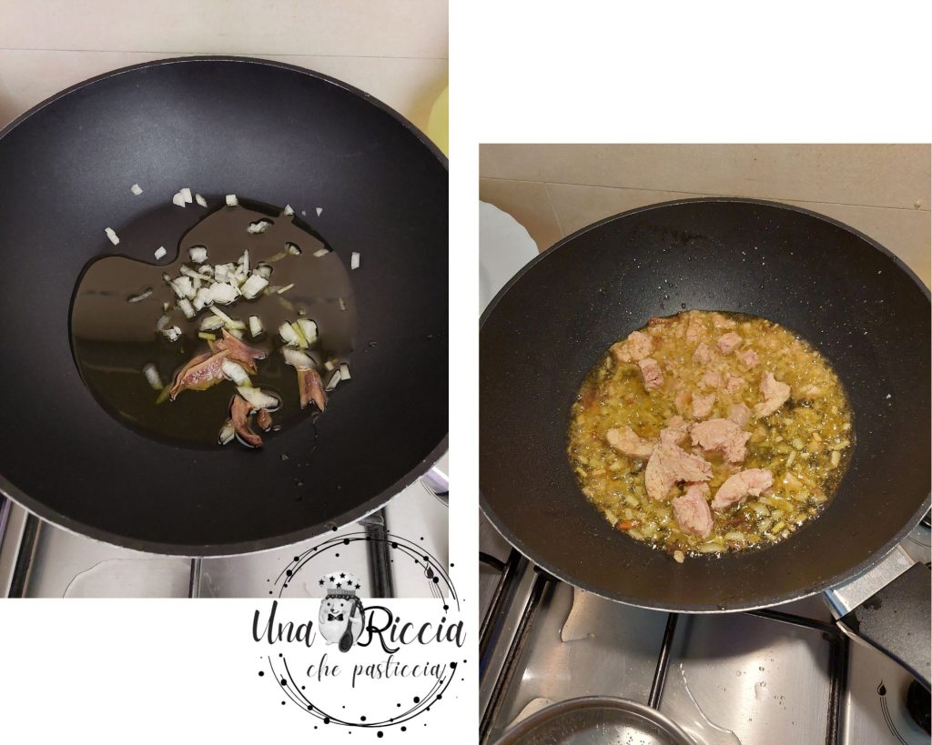 Dans une poêle antiadhésive à bords hauts, mettons l’huile d’olive, un morceau d’oignon finement haché et trois filets d’anchois en conserve grossièrement hachés, laissons légèrement frire et faire fondre les anchois, puis ajoutons le thon en boîte en mettant aussi une partie de l’huile de la boîte. (j’ai utilisé 3 petites boîtes de 80 grammes, 2 je les ai mises avec l’huile et 1 je l’ai égouttée). Laissez cuire quelques minutes.