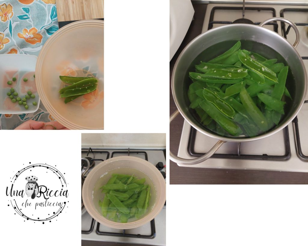 • Après avoir écossé les pois et obtenu la quantité de cosses dont nous avons besoin, lavez-les à l’eau et mettez-les à bouillir dans une casserole pleine d’eau pendant 10 minutes. Une fois les 10 minutes écoulées, égouttez-les dans un bol d’eau très froide pour conserver la couleur verte vive et laissez refroidir un peu.