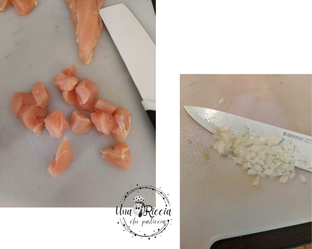 Prenons le blanc de poulet entier, posons-le sur une planche à découper et avec un couteau, coupons-le en morceaux en essayant de les faire de la même taille pour obtenir une cuisson homogène et mettons-les dans un bol. Hachons finement l’oignon aussi.