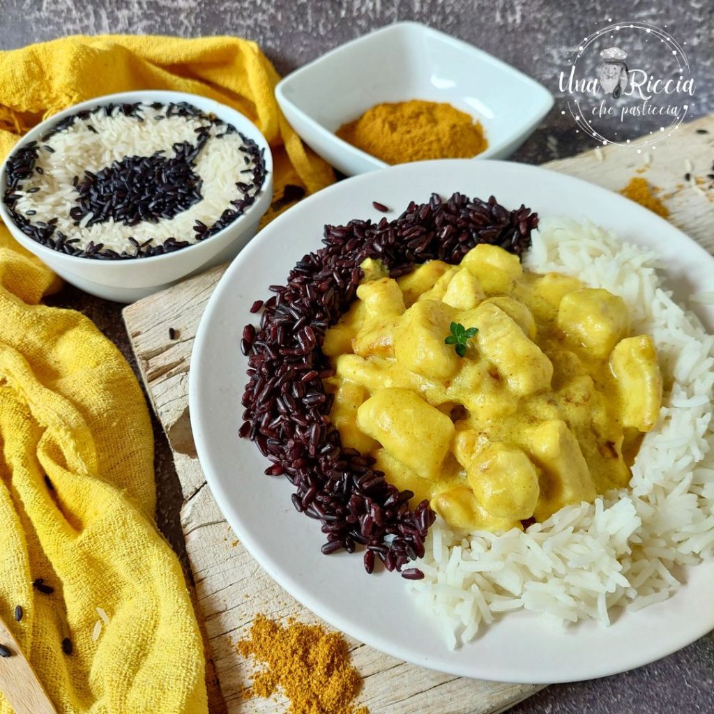 Aujourd’hui, recette pour un second plat de viande : poulet crémeux au curry avec riz venere et riz basmati.